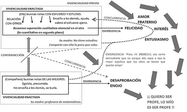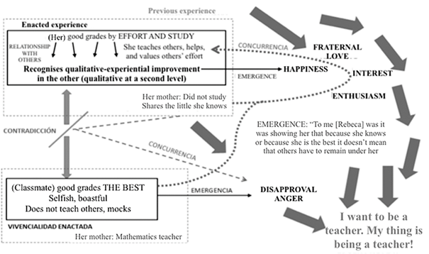 Las características de su compañera rival que era la mejor, pero con arrogancia, egoísmo y soberbia, que presumía y se mostraba superior a los demás, se contraponía con el modo de comprender lo relacional de Rebeca (con relación al saber y el prójimo), haciendo emerger en ella actos conducentes a la valentía y a la generosidad de compartir sus conocimientos, incluso con una automirada de no ser la mejor. A través de esas vivencias, movilizada por la emoción de desaprobación respecto del actuar de su compañera, se va activando en su persona un ansia de ayudar a sus amigas con mayor dificultad en la materia y se genera desafíos y una práctica inicial para la enseñanza. Esta emoción de desaprobación - en ese sentido - tiene un carácter centrado en la emergencia, pues emerge (entra al cuadro configurativo) a propósito del actuar de su compañera. Lo mismo puede decirse del interés y el entusiasmo por ayudar a otros, que emerge en ella. Este fluir emocional que forma parte de su complejidad vivencial, va generando en Rebeca un sentir me gusta que el conocimiento que tengo repartirlo no dejarlo para mí.