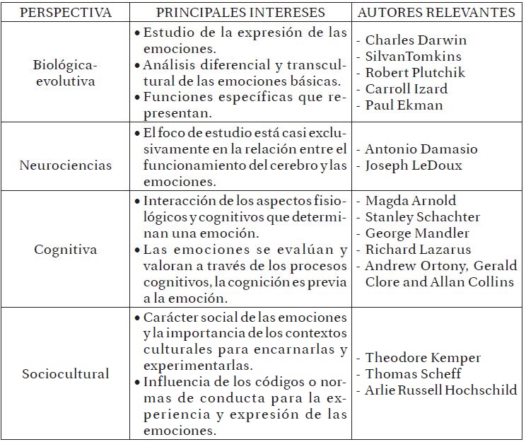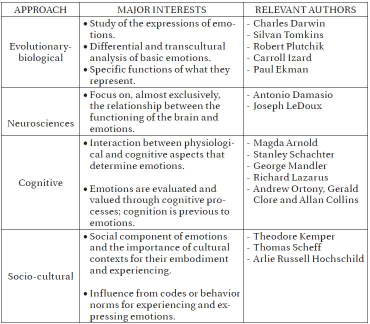 Las emociones son reconocidas como una entidad compleja y multidimensional, que puede estudiarse desde diversas perspectivas. En la Tabla 1 se exponen algunos acercamientos identificando intereses principales y autores más representativos.