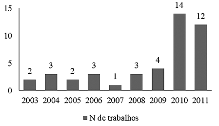 Observa-se, por meio do Gráfico 1, que o interesse pelas relações entre avaliação externa e gestão aumentou consideravelmente nos últimos anos. Os primeiros trabalhos acadêmicos que procuraram associar os dois temas foram defendidos em 2003, ainda que se note que as discussões sobre as avaliações externas comecem a aparecer, em âmbito acadêmico, a partir de 1998 (ver Bauer, 2012; Bauer; Reis, 2013). A ampliação do interesse pela temática deu-se a partir de 2009, sendo que o número de trabalhos defendidos em 2010 e 2011 (26 trabalhos) supera a somatória de trabalhos finalizados nos anos anteriores (18 trabalhos).