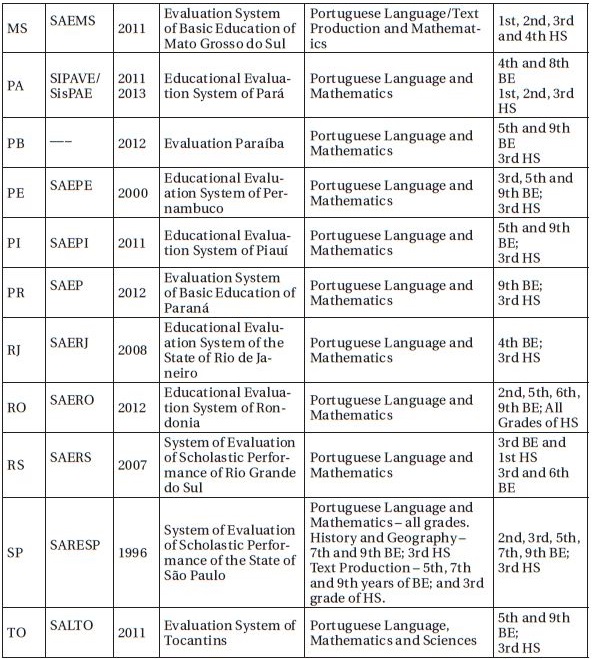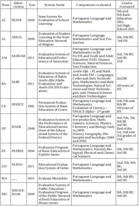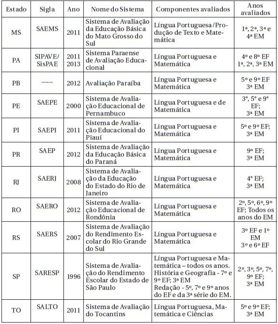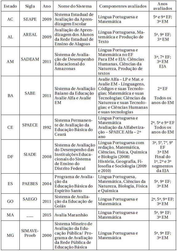 Em decorrência, observa-se a ampliação da proposição de modelos locais de avaliação a serviço do monitoramento das redes, permitindo-lhes antever os possíveis resultados alcançados no indicador e fazer intervenções focalizadas para melhorá-los. Para ilustrar esse movimento, pode-se dizer que em levantamento realizado durante o ano de 2016, dos 27 estados da federação brasileira, 21 possuíam suas próprias propostas de avaliação externa, como mostra a Tabela 1. Os dados ilustram a crescente adesão dos estados a essas avaliações, com base no entendimento de que propiciam a obtenção de informações para o gerenciamento administrativo e pedagógico das redes.