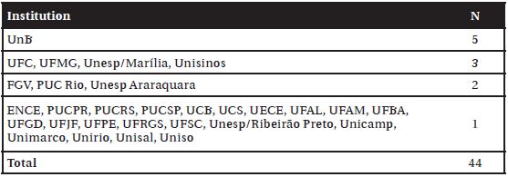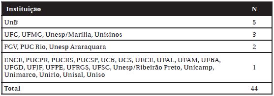 É possível notar, pela Tabela 2, que a produção acadêmica em tela é proveniente de 30 diferentes instituições. Em grande parte delas (n=21) produziu-se apenas um trabalho, sendo sua maior concentração na UnB (n=5). Algumas instituições, no entanto, parecem abarcar linhas de pesquisa em que trabalhos dentro dessa temática são mais recorrentes, a exemplo da Unisinos, da UFMG, da Unesp de Marília e da Universidade Federal do Ceará (UFC), cada uma com três trabalhos produzidos.