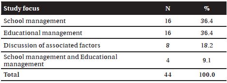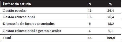 Ressalta-se, contudo, que essa organização tem propósitos didáticos, visto que em trabalhos cujo foco de análise é a gestão escolar, por vezes investiga-se também a utilização das avaliações na gestão educacional nos demais nível de implantação da política. De todo modo, percebe-se que são poucos os trabalhos que procuram concatenar as perspectivas dos gestores do sistema com as dos gestores escolares e professores (n = 4), assumindo uma perspectiva de análise mais global.