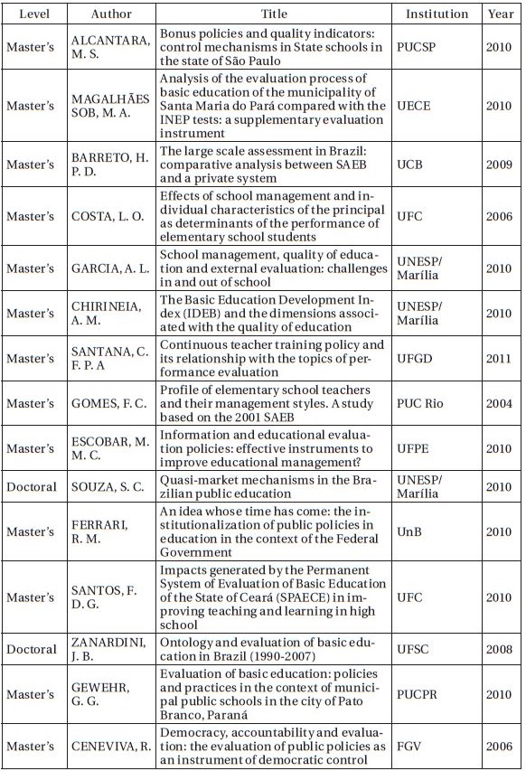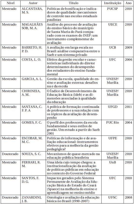 Este trabalho é fruto do levantamento realizado no Banco de Teses e Dissertações da Capes de estudos produzidos no período de 1988 a 20112, na temática de avaliação de sistemas educacionais no Brasil, originando uma base de dados com 294 trabalhos3.
