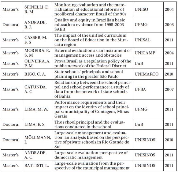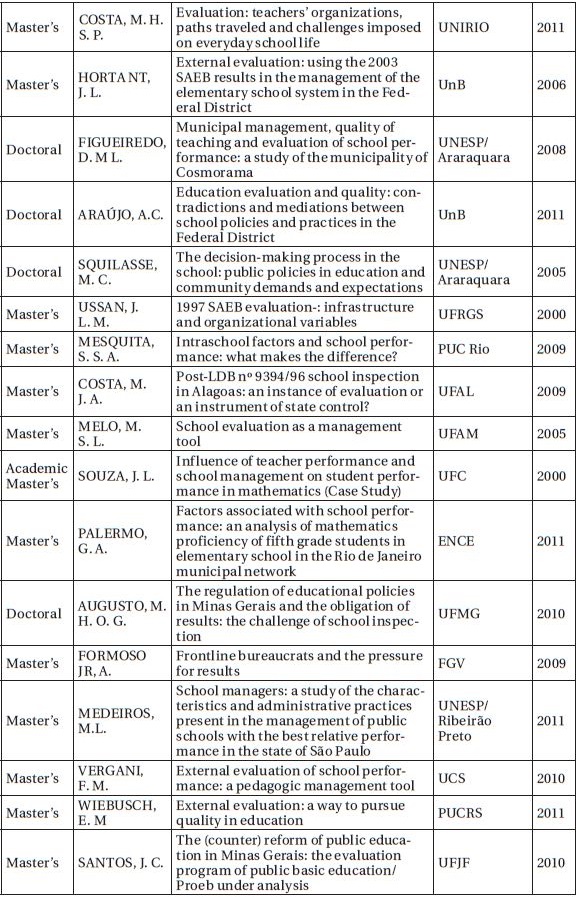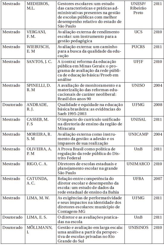 Em síntese, os vários trabalhos contribuem, a partir de diversos focos e objetos de análise, para o entendimento das concepções de gestão que informam tanto a gestão educacional, quanto a escola. Seja por meio da discussão da institucionalização de uma concepção de gestão educacional eivada de princípios da Nova Gestão Pública, pela sua contraposição à concepção de gestão democrática ou por meio do uso de conceitos como quase mercado, desresponsabilização estatal e regulação, os trabalhos de doutorado parecem avançar no sentido de incorporar suportes teóricos que permitem avançar na compreensão dos modelos de gestão calcados na avaliação externa.