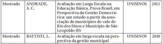 Diversos estudos têm como objeto a análise de fatores associados aos resultados de desempenho dos alunos obtidos em avaliações em larga escala a partir da consideração de diversas variáveis, constituindo um veio analítico específico (Souza, 2000; Ussan, 2000; Catunda, 2007; Mesquita, 2009; Chirineia, 2010; Wiebusch, 2011; Palermo, 2011; Costa, 2006). Cabe observar que, muitas vezes, nestes estudos, a gestão, e suas características, em nível macro, meso ou micro, são tomadas como variável para a compreensão do fenômeno do desempenho dos alunos. A distribuição dos mestrados e doutorados nesses quatro eixos é apresentada na Tabela 3.