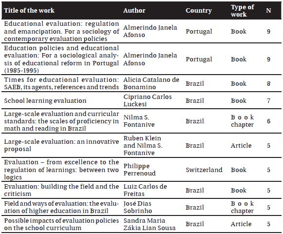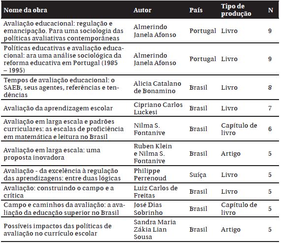 Outro tipo de discussão que encontra solo fértil nos trabalhos analisados tende a referenciar a crítica ao que se denomina de Estado Neoliberal, à influência dos organismos multilaterais na proposição das propostas avaliativas, à ascensão do Estado Avaliador, que se desresponsabiliza do gerenciamento direto do sistema, focalizando na gestão por resultados, etc. Tais trabalhos, geralmente, baseiam-se na obra de Almerindo Janela Afonso como referência teórica. A Tabela 5 explicita quais foram as principais obras utilizadas nos 44 estudos em tela, apresentando, ainda, o número de vezes em que elas apareceram citadas.