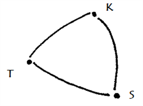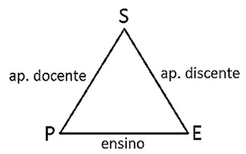 O triângulo da Figura 2 pode ser assumido como um triângulo de relações com o saber envolvendo o professor (P), os estudantes (E) e o saber ou conteúdo (S) e representa a sala de aula. Esse triângulo tem sido utilizado por diversos autores (Gauthier et al., 2006; Houssaye, 2007; Arruda; Lima; Passos, 2011). Para Gauthier et al. (2006, p. 172), ele pode ser denominado “triângulo didático” ou “triângulo pedagógico”. O que difere um autor do outro é a maneira como as arestas do triângulo são interpretadas. Nós assumimos que as arestas P-S, P-E e E-S podem ser interpretadas da seguinte forma: