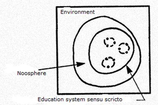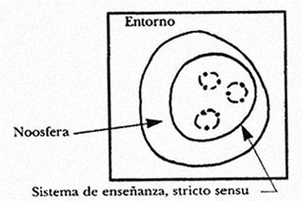Essa mesma relação triangular é denominada por Chevallard (2005) de Sistema Didático, uma unidade básica de análise, utilizada por ele para desenvolver suas ideias sobre a transposição didática. Um conjunto de sistemas didáticos é denominado Sistema de Ensino, o qual está imerso no entorno social. Entre o sistema de ensino e a sociedade existe o que o autor chama de noosfera, ou seja, uma camada intermediária responsável por definir a maneira como deve funcionar o sistema de ensino e, por consequência, os sistemas didáticos (as salas de aula). Tais representações podem ser visualizadas nas Figuras 2 e 3: