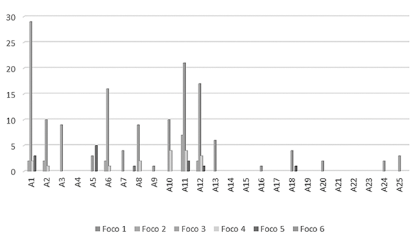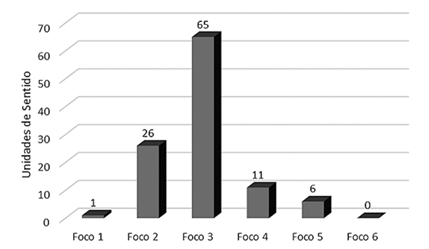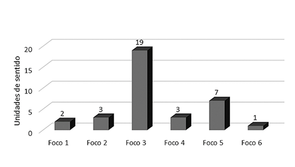 A totalização dos trinta e cinco excertos da entrevista acomodados em cada um dos seis focos está representada no Gráfico 1.