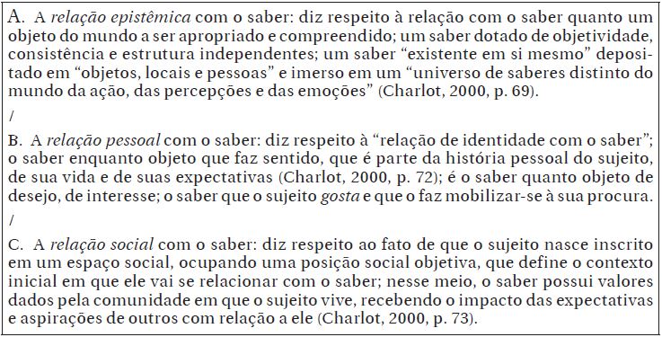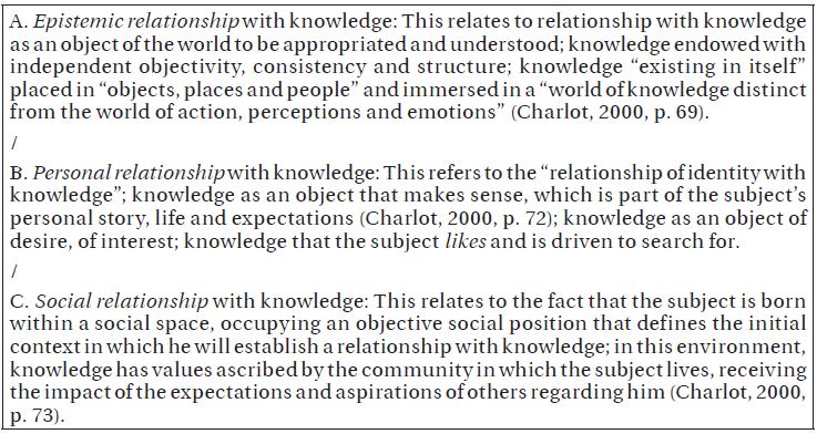 Para esse universo particular, podemos definir três dimensões da relação com o saber, conforme inserimos no Quadro 1: