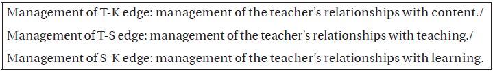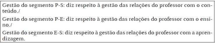P-S indica as relações que o professor P estabelece com o saber S, como uma disciplina, um conteúdo, um conceito etc., ou seja, representa a aprendizagem docente1, conforme percebida e/ou praticada pelo próprio professor.
