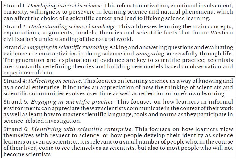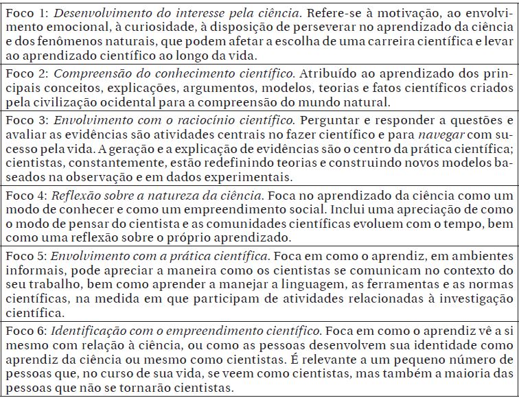 Em um relatório do National Research Council (2009, p. 42), o aprendizado científico em ambientes informais é concebido como um conjunto de seis dimensões, que se entrelaçam como fios de uma corda - strands of a rope - “[…] tecidos para produzir experiências, ambientes e interações sociais”, atraindo “[…] pessoas de todas as idades e experiências na direção de uma maior compreensão, fluência e perícia científicas” (Arruda et al., 2013, p. 07). Tais strands - os quais preferimos denominar de focos da aprendizagem científica, por dificuldade na tradução - são apresentados no Quadro 3: