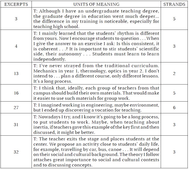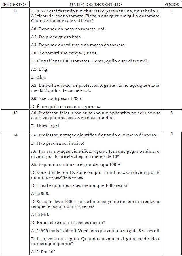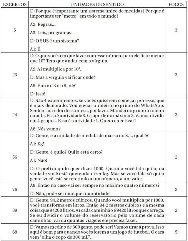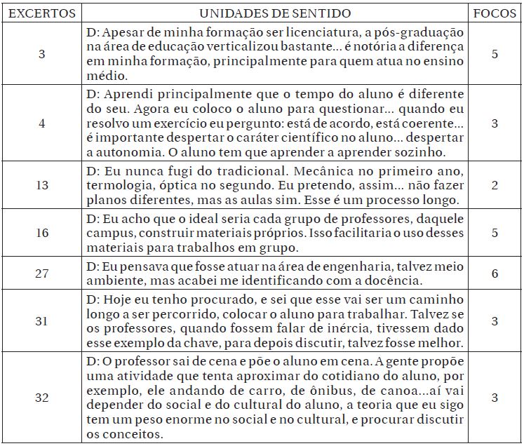 No Quadro 4 trazemos alguns elementos desses procedimentos analíticos, explicitando a numeração dos excertos, as unidades de sentido (relatos do docente) e o foco em que essas unidades foram alocadas. Apresentamos apenas alguns exemplos de unidade de sentido, pois apresentar a entrevista em sua completude tomaria inúmeras páginas deste artigo.