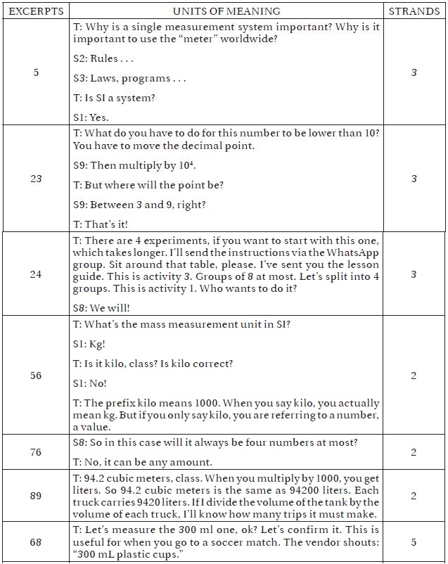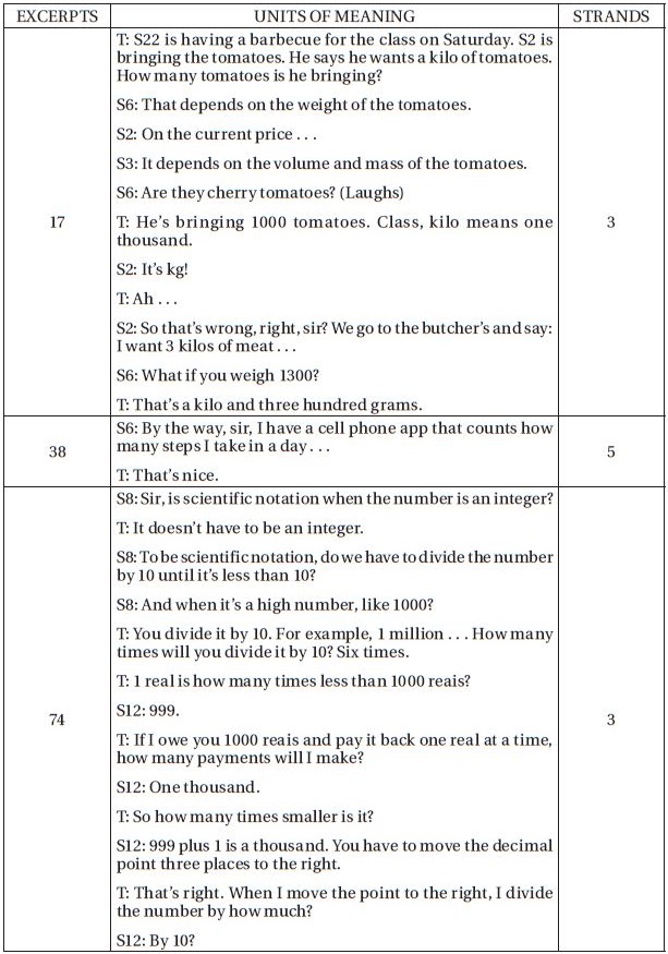 No excerto 17, o docente faz uma indagação à turma envolvendo a ideia de prefixos de unidades de medida. Como no cotidiano é comum se expressar à unidade de medida de massa no Sistema Internacional de Unidades (SI) como kilo, e não kg, o docente utiliza esse fato como estratégia para ensinar o conceito. Quando pergunta sobre quantos tomates tem 1 quilo, A6 e A3 interpretam que ele está se referindo a kg e dizem que “[…] depende do peso do tomate”, “[…] depende do volume e da massa do tomate”. Quando o docente diz que serão 1000 tomates, A2 logo percebe que, nesse caso, o correto é kg, compreendendo então a diferença entre prefixo e unidade de medida. Essa sequência discursiva também representa uma cadeia de perguntas e respostas, na busca de evidências para a resolução de um problema.