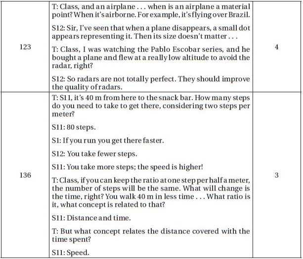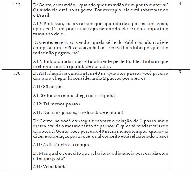 Em um dos episódios supracitados (excerto 136), o docente lança mão de um problema envolvendo os conceitos de velocidade, distância percorrida e tempo. A pergunta deflagradora foi sobre a quantidade de passos que deveria ser dada até a cantina, considerando que, a cada dois passos, percorre-se 1 m, e que a distância a ser percorrida era de 40 m. A11 logo percebe que a resposta é 80 m. Quando A1 interage no diálogo, perguntando “[…] se for correndo chega mais rápido” (levantamento de hipóteses), acaba introduzindo uma noção de velocidade, levando A12, equivocadamente, a afirmar que daria menos passos. A11 faz uma avaliação de evidências, dizendo que “[…] dá mais passos, a velocidade é maior!”. O docente intervém nesse instante, salientando que a razão de 1 passo para meio metro será mantida, e acrescenta que o que irá mudar, nesse caso, será o tempo gasto. Quando questionados sobre qual o conceito que relaciona distância e tempo, A11 responde que é a velocidade, o que se caracteriza como indício de aprendizagem desse conceito pelo discente. Essa sequência discursiva representa uma cadeia de um processo de investigação, por isso alocamos no foco 3.