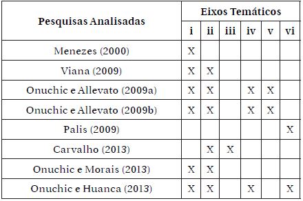 Os dados apresentados no Quadro 2 evidenciam que os eixos temáticos que concentram mais reflexões referem-se às características esperadas de um bom professor de Matemática (tema que permeia seis trabalhos) e à formação inicial do professor (também presente em seis das pesquisas). Quatro dos trabalhos que trazem discussões sobre a formação inicial também evidenciam preocupações quanto ao que caracteriza um bom professor de Matemática, o que a nosso ver é esperado, uma vez que o objetivo central de todo curso de Licenciatura em Matemática deveria ser o de efetivamente formar professores competentes nessa ciência. Reflexões sobre a formação inicial do docente que irá lecionar Matemática na Educação Básica estão presentes em apenas uma das pesquisas analisadas, que, contudo, não dedica atenção às características desejadas para esse professor.