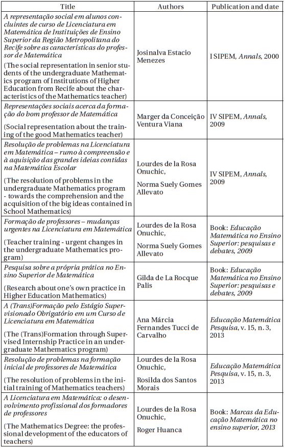 Com a leitura dos documentos que compõem o corpus desta pesquisa, evidenciou-se, como esperado, uma maior frequência de investigações direcionadas às reflexões sobre a formação inicial do professor de Matemática, ou seja, sobre diferentes aspectos relacionados aos cursos de Licenciatura em Matemática. Nessas fontes são discutidos:
