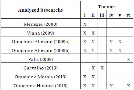 Finalmente, procedemos à categorização dos dados obtidos da leitura dos textos selecionados, ou seja, agrupamo-los em categorias, que conforme Bardin (2001) são classes que reúnem grupos de unidades de registro sob um título genérico em razão das características comuns desses elementos. Definimos então as seguintes categorias temáticas: