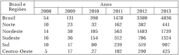 Em meio a esse contexto e tendo por referência dados de pesquisa nacional sobre os impactos do Programa Mais Educação (Brasil, 2013) é possível perceber que, no período de 2008-2013, ocorreu um expressivo avanço da presença do Programa entre os municípios brasileiros. A análise dos dados da Tabela 1 permite deduzir que, em 2013, o Programa Mais Educação se fez presente em 86,9% dos municípios do País e em todas as redes estaduais e Distrito Federal, configurando-se como uma das mais relevantes iniciativas em âmbito nacional para indução de políticas de educação integral em tempo integral já ocorridas no Brasil.