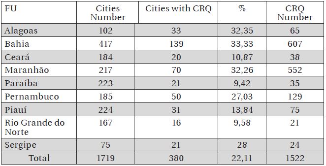 Alagoas (32,35%), Bahia (33,33%) and Maranhão (32,26%) coincide regarding percentage of cities in the state with CRQ. In an intermediary group, there are Pernambuco (27,03%) and Sergipe (28%). The other states present percentage lower than 14%, with Paraíba being the state with the lowest percentage (9,42%).