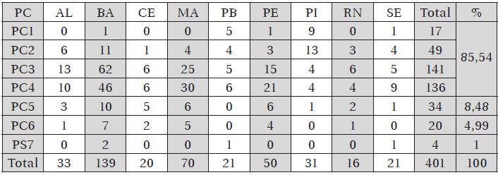Distribution of cities with CRQ do not follow a pattern either, when we consider the size of cities [Populational Class (PC)]. As it can be observed in table 2, the total distribution of CRQ happens in all populational classes. However, 69,07% (n = 277) of communities are in cities from 10 to 50 thousand inhabitants (CP3 and 4). It stands out the fact that great number of certified communities in cities under 5 thousand inhabitants are in the state of Piauí and 60% are in cities up to 10 thousand inhabitants.
