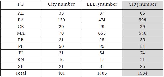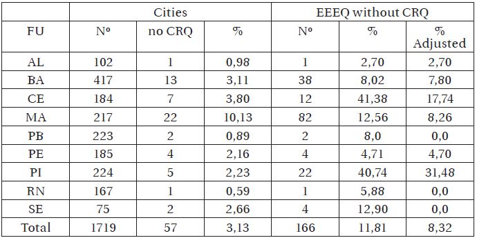 Removing these two realities of population placed in table 5, there is a column for adjusted percentage. As it can be seen, Ceará and Piauí present high number of EEEQ in cities with no CRQ. Only Paraíba, Rio Grande do Norte and Sergipe do not show this kind of problem. This reality demands more clarification from educational authorities.