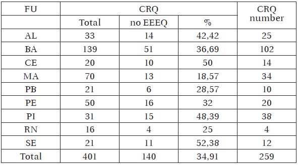 Complementary to this information, it is important to observe the number of cities with CRQ where there is no EEEQ. As it is shown by table 4, in over a third of cities with CRQ there is no EEEQ (34,91%). The best performance could be found in the state of Maranhão (18,57%). There, there is a lower number of cities with CRQ and no EEEQ. The second best result was found in the state of Rio Grande do Norte (25%).