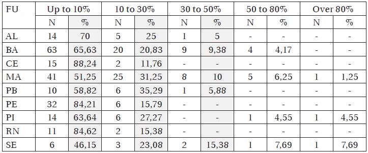 With a percentage of over 30% of enrolments, the number of cities is 35, spread around the states of Alagoas, Bahia, Maranhão, Paraíba and Sergipe. Bahia and Maranhão are the states with more cities in a percentage over 30% (13 and 14, respectively). Maranhão is responsible for the highest percentage of cities, 45,16% (n = 14), and Bahia comes in second place, with 41,94% (n = 13). It is necessary to emphasize that these are the two states in the Northeast region with the highest number of CRQ.