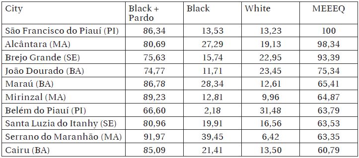 Based on this information, we analyzed the composition race/color in 10 cities with the highest percentage of enrolments in EEEQ, according to table 7. Such municipalities show high variation in the percentage of black and white population. The city with the highest percentage of white population is Belém do Piauí, 31,48%. The lowest, Serrano do Maranhão, only 6,42%. Regarding race/black color, municipalities present great variation. Serrano do Maranhão has 39,45% of black population and Belém do Piauí, 2,18%. Despite these differences, they present the same percentage of enrolments in EEEQ (63%).
