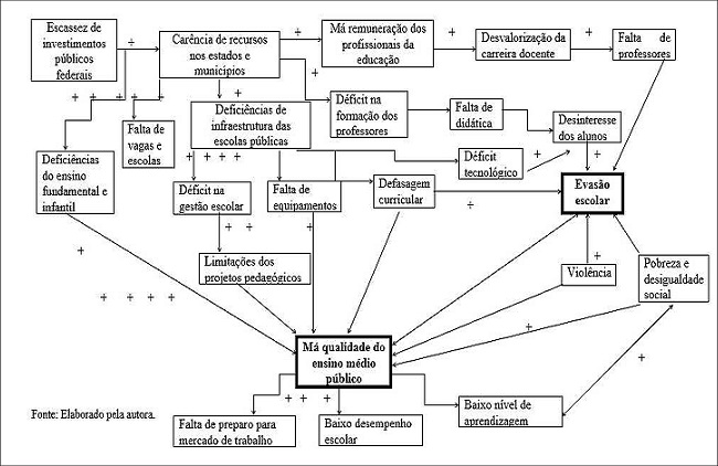 Em razão da complexidade e multidimensionalidade dos problemas do ensino médio brasileiro, essa técnica será utilizada para facilitar a visualização da dinâmica e das relações de causalidade entre esses fatores para, a partir disso, ser possível visualizar a completude do problema que foi objeto da Lei 13.415 (Brasil, 2017).