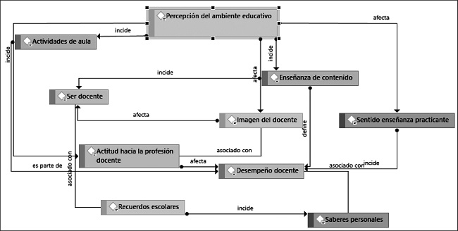 Por otra parte, las relaciones que se identifican en las expresiones de los alumnos del Prácticum, muestran la incidencia que tiene la percepción del ambiente educativo por parte de estos, en las actividades de aula, enseñanza del contenido, sentido de la enseñanza, imagen y actitud docente. Así, el reconocimiento que se realiza del contexto escolar es una fuente de información que para el alumno es un referente importante para desarrollar un modelo pedagógico y metodológico en el aula (Figura 1).