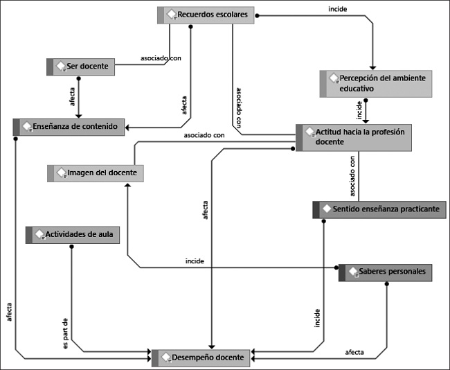 Respecto de lo anterior, en la licenciatura se presenta la situación contraria ya que son los recuerdos escolares los que articulan el ser docente y enseñanza de contenido. Por su parte, la percepción del ambiente educativo se vincula directamente con la actitud hacia la profesión docente, la cual tiene una mayor correlación con otros códigos como imagen docente, sentido de la enseñanza del practicante y desempeño docente (Figura 2).