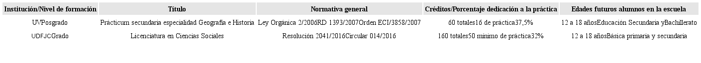 Es importante tener en cuenta algunas diferencias de los alumnos en los dos programas, en la UV son profesionales en una disciplina específica que realizan el Prácticum para desempeñarse como docentes en los institutos, por ello, sus edades oscilan entre los de 25 y 30 años. Mientras que los alumnos de la UDFJC son jóvenes egresados de la básica secundaria que ingresan para obtener un título profesional en licenciatura en ciencias sociales, por lo cual sus edades oscilan a entre los 16 y 20 años.