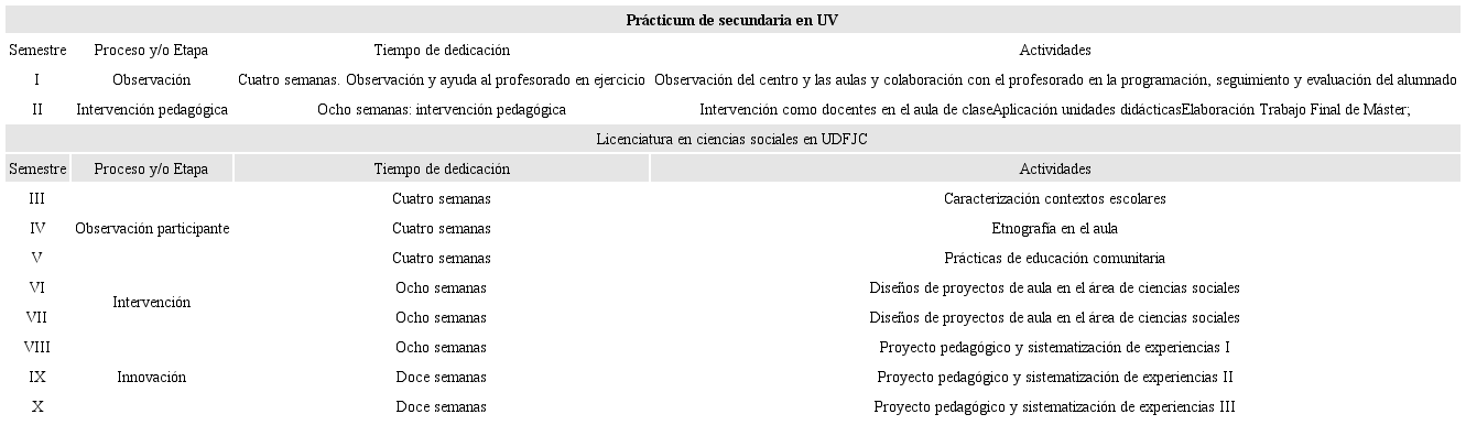 En este sentido, en la UV el Prácticum se desarrolla durante las doce semanas indicadas para su realización en cada curso académico, cuya primera parte se centra en la observación crítica de la realidad de la enseñanza y a partir de la segunda semana hasta su finalización, se dirige especialmente al desarrollo de prácticas docentes y a la redacción del Trabajo de Máster. En la UDFJC la actividad pedagógica se desarrolla de tercero a décimo semestre, organizada en tres momentos: observación, intervención e innovación.