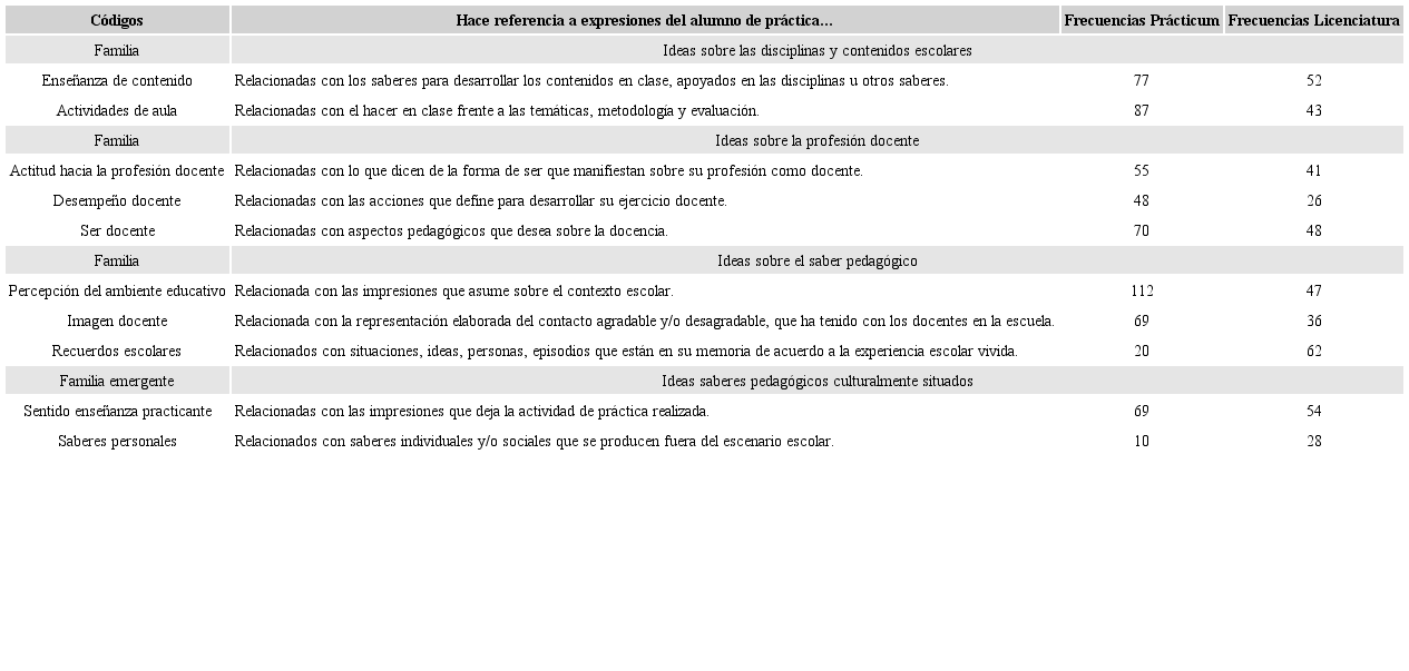 En tercer lugar, aparecen los códigos relacionados con la familia de ideas sobre el saber pedagógico, la cual considera las percepciones del futuro docente sobre su actuación en la práctica y el espacio escolar donde se desenvuelve. Por último, producto el análisis emerge una familia denominada ideas de los saberes pedagógicos culturalmente situados, que reconoce el valor tanto de los ámbitos de saber propios de la profesión, como de las actividades socialmente valoradas en las que la cognición distribuida que en términos de Cole y Engrestron (2001), aporta la visión de un saber producido no sólo en la formalidad de la academia, sino en los procesos sociales en los ellos participan.