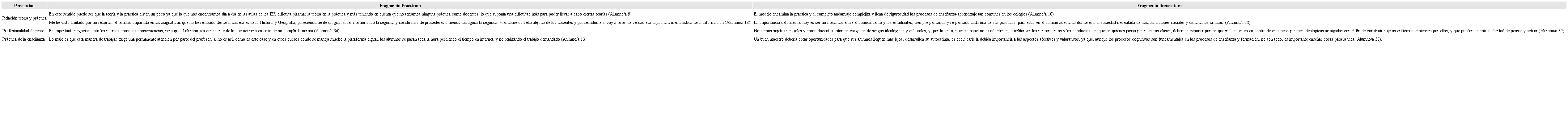 En relación con las percepciones en las cuales se encuentran expectativas y temores, observamos alguna diferencia entre los alumnos del Prácticum y la licenciatura, en relación con el sentido de la práctica y acompañamiento de la misma, el significado de la enseñanza y las memorias escolares (Tabla 5).
