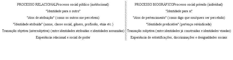 O processo institucional, público, portanto, de constituição das identidades dos sujeitos vem na sequência e será sucedido pelo último eixo do trabalho, a identidade relacional para si.