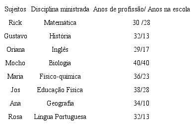A tabela abaixo apresenta os sujeitos, as disciplinas ministradas e o tempo de exercício do ofício. Sabe-se que a disciplina ensinada é um fator fundamental da afirmação da identidade profissional. Nessa lógica, afirma-se que esses conhecimentos disciplinares são reinterpretados por cada professor a seu próprio modo, a partir do arcabouço da sua história de vida e na lida diária, na relação com seus estudantes, formando, desta maneira, a chamada identidade para si de que fala Dubar (2005). Depois, todos os professores têm de 29 a 40 anos de exercício da docência na escola básica portuguesa, o que os habilita a serem categorizados como professores experientes.