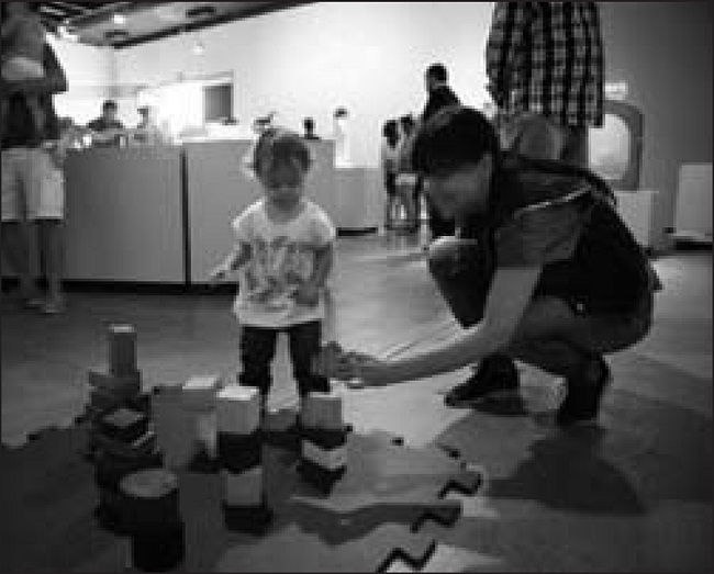 Os educadores do No Colo criaram estratégias bastante interessantes, como a criação das estações no espaço expositivo, a presença da música e as oficinas. No entanto, no contexto das propostas observadas, nem sempre os materiais escolhidos para compor com o espaço da exposição demonstraram provocar tantos desdobramentos. À ocasião da exposição Gaudí: Barcelona 1900, a arquitetura foi o conceito explorado pelos educadores, foram disponibilizados jogos de empilhar. Os blocos de montar fazem uma referência clara ao ato de construir, sendo, dessa forma, pertinente a sua escolha. Porém, qual conceito presente na arquitetura de Gaudí, artista singular na maneira de conceber seus trabalhos arquitetônicos, podia ser explorado pelos participantes?
