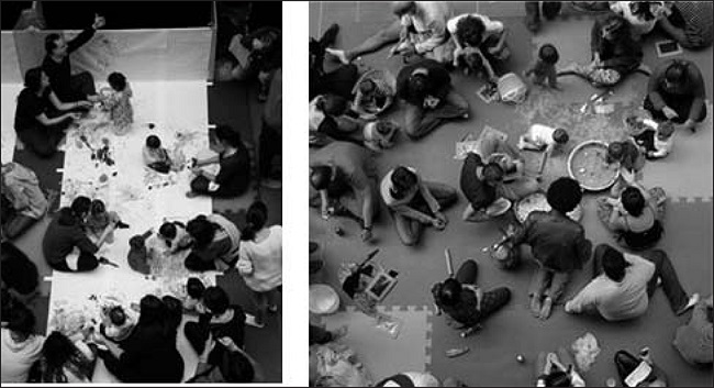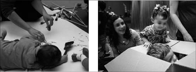 As oficinas, ou proposições práticas, aconteciam, em geral, no espaço do hall central do Instituto. Muitos visitantes que passavam pareciam curiosos e surpresos por encontrar ali aquela cena: bebês e adultos em meio a caixas, tintas ou outros materiais. No entanto, não apenas os visitantes eram surpreendidos, por diversas vezes, os cuidadores também demonstravam estar experimentando algo novo. Pintar numa grande superfície com tintas incomuns (feitas com elementos naturais como curry ou espinafre); conhecer o urucum; articular gesto e pintura ao escutar os guizos escondidos em fronhas; brincar com caixas de papelão aparentavam ser novidade. As reações das crianças também pareciam surpreender, principalmente quando os acompanhantes percebiam que não precisavam obedecer a determinadas condutas, como é possível verificar no fragmento destacado. Os bebês experimentavam com o próprio corpo, observavam as marcas de suas atitudes na reação do outro e na resposta dos materiais: numa mancha no papel, na textura de uma superfície, no som de um guizo, na ocupação de um outro espaço ou nos olhares e respostas dos demais participantes.