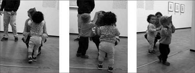 Na exposição Os Muitos e o Um - Arte Contemporânea Brasileira, em uma das sessões do No Colo, a maior parte dos acompanhantes não caminhou pela exposição, indo direto para onde se encontravam os estímulos sensoriais preparados para os bebês. Quando o grupo estava em uma das arenas, uma das bebês transitava pelos participantes e materiais disponíveis, e, volta e meia, contemplava as fotografias da artista Ana Maria Maiolino. Acompanhando a atividade, ao perceber que a pesquisadora havia reparado nessa atitude, a mãe comentou: “acho impressionante como ela está olhando as obras”. Na sessão seguinte (nesse dia extraordinariamente foram realizadas duas sessões), uma atitude do músico modificou o percurso das famílias pela exposição: ele se deslocou por diversos cantos da galeria, como que convidando os participantes a explorá-la, o convite foi aceito.