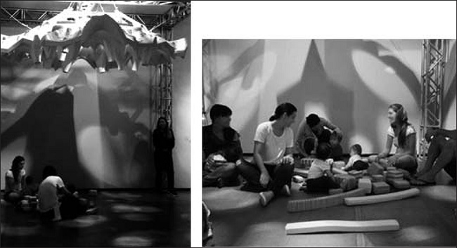 Especificamente com relação à exposição de Gaudí, o jogo de volumes e ocupação dos espaços estava presente, provocando muitas interações e relações com a espacialidade. Entretanto, as caixas de papelão com recortes geométricos que evocavam vitrais traziam pouca relação do pensamento singular desse arquiteto. Já em Os Muito e o Um [...], a proposta foi bastante focada no tapete inspirado nas pesquisas terapêuticas de Lygia Clark. Mesmo com a presença de elementos que evocavam pertinentemente a obra de Ernesto Neto, não se fez presente algo que complexificasse a experiência com as diferentes texturas ou que fizesse um diálogo mais intenso com as obras de Lygia Clark (ou de outros artistas) em exibição.