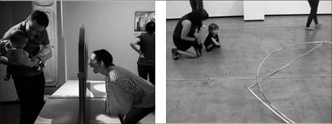 Segundo espaço [na exposição]: sob uma maquete/ réplica de estrutura (abóbada) do arquiteto há algumas ‘almofadas’ em diferentes formatos geométricos que lembram os cubos de montar. [...] Nesse mesmo local, uma mãe mostra para o bebê a peça que está sobre eles. O bebê acompanha o olhar materno e passa a mostrar a estrutura para outras pessoas, apontando-a. Uma mãe se deita no chão com o seu bebê para observarem melhor a estrutura da abóbada. Outras mães fazem o mesmo, mas alguns bebês não gostam de ficar deitados e observam a peça sentados. A musicista se aproxima e o bebê dança e bate palma. Ele para por um instante, aponta para o teto mostrando-o para a musicista que olha e aponta também, como quem diz ‘também estou vendo!’. Os dois sorriem, compartilhando e desfrutando dessa pequena descoberta estética (Caderno de campo, 04 de dezembro, 2016/ Exposição Gaudí: Barcelona 1900).