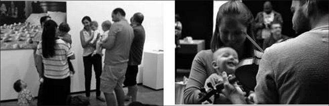 Os encontros costumavam contar com a participação de músicos, presença sempre notada pelos bebês. A curadoria do estilo musical e instrumentos era realizada pelos músicos convidados pelos educadores, buscando estabelecer conexões estéticas com as obras expostas. Embora não possuam qualquer instrução, os bebês são capazes, por exemplo, de discriminar ritmos, tons, timbres, harmonias e melodias de sons vocais e instrumentais (Trevarthen, 2011). Nas sessões do No Colo, as crianças se mostraram atentas às mudanças de sonoridade, principalmente quando um novo instrumento era tocado. Os músicos eram receptivos aos olhares e convocações dos bebês, sorrindo e brincando com o ritmo e sonoridades para provocar aqueles que os procuravam. Dessa forma, os profissionais mostravam-se sensíveis à capacidade intersubjetiva infantil e conscientes da importância de uma atitude responsiva e provocativa.