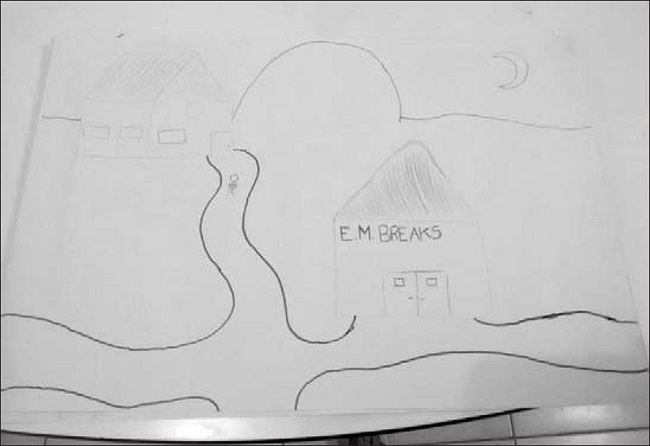 No desenho abaixo, João2 desenhou a história de um jovem que faz o percurso da escola para casa. A escola tem o nome de Breaks. Quando perguntado sobre o motivo desse nome, João disse que Breaks era o nome de um grupo que ele havia formado na escola com três amigos e colegas (G2, 3º encontro). Neste desenho [Figura 1], além do fato significativo da escola levar o nome do grupo de amigos, chama atenção a utilização da palavra break, que em inglês pode significar intervalo, recreio, ruptura, descanso, ou até oportunidade.