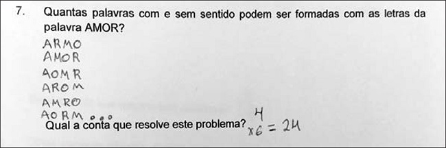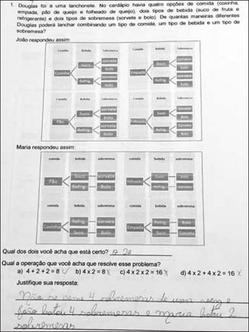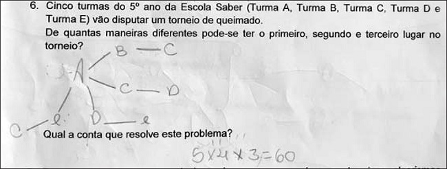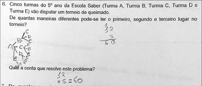 Na Tabela 3 é possível observar que o quantitativo de justificativas incorretas ou em branco (87,5%) para as respostas dadas é muito superior ao de justificativas corretas (12,5%). Nas justificativas incorretas apresentadas, de um modo geral, não há explicação, de fato, do motivo pelo qual uma expressão numérica é correspondente ao enunciado em língua natural ou à listagem e árvore de possibilidades. Em alguns casos, estavam relacionadas apenas com o tratamento isolado das operações ou, por exemplo, com dificuldades em compreender a representação em árvore, como é possível observar na Figura 1.