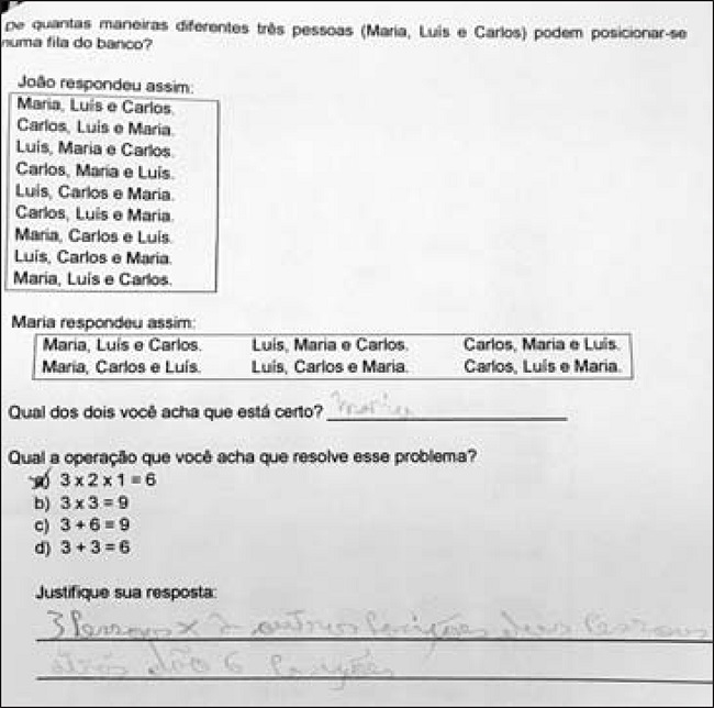 As justificativas corretas indicam textualmente o motivo pelo qual a operação escolhida indica a resposta correta, como pode ser observado na Figura 2, a seguir. Neste exemplo, o aluno respondeu que são “3 pessoas x 2 outras posições das pessoas atrás dão 6 posições”, ou seja, são três pessoas para se posicionar numa fila sendo que quando uma está em primeiro lugar da fila as outras duas pessoas ocupam ora o segundo, ora o terceiro lugar, assim, são duas possibilidades para cada um ocupando a primeira posição da fila. Com a justificativa é possível observar que o aluno em questão percebeu o princípio multiplicativo envolvido no problema e coordenou de forma satisfatória os três registros de representações apresentados na situação - o enunciado em linguagem natural, a árvore de possibilidades e a expressão numérica correspondentes.
