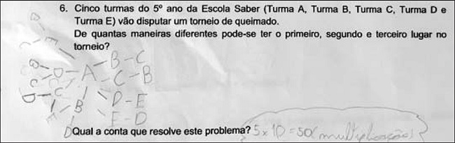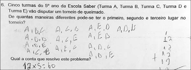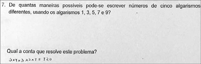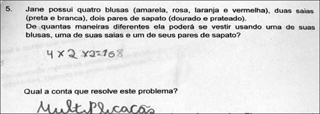 Em relação às representações utilizadas, todos os anos escolares, no pré-teste tiveram preferência pela listagem (Figura 4), ou por uma operação matemática, que podia ser correta ou incorreta para a situação (Figura 5). O PFC foi usado no pré-teste apenas em situações de produto cartesiano, situação em que os números do enunciado são utilizados para responder o problema (Figura 3). No 9º ano ocorreu, ainda no pré-teste, o uso da generalização de possibilidades, por meio de uma listagem sistemática seguida de uma multiplicação que responde corretamente a situação (Figura 6).