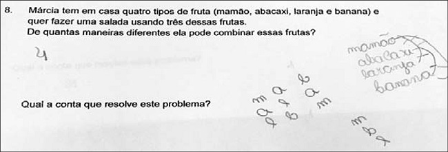 Na Tabela 1 pode-se observar, ainda, que no Teste 2 houve maior número de acertos, tanto para a primeira conversão, quanto para a segunda. Entretanto a diferença entre os testes era apenas nas situações de combinação, em que, nessas situações, os casos repetidos eram riscados, de modo que deixava explícito que para essa situação a ordem de escolha dos elementos não gera novas possibilidades. Pode-se inferir que, possivelmente a explicitação do invariante de ordem na situação de combinação pode ter influenciado o desempenho dos alunos também nos outros tipos de problemas combinatórios. Assim, os alunos prestaram mais atenção às diferenças entre os problemas no que diz respeito à ordenação dos elementos constituindo, ou não, possibilidades distintas.