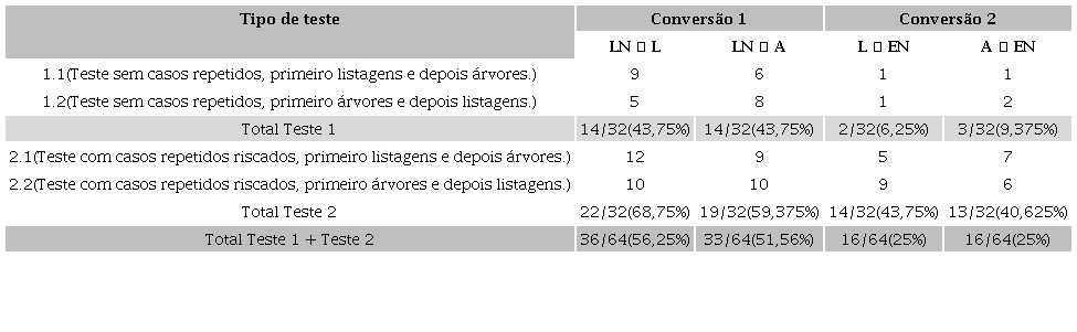 Na Tabela 1 pode-se observar a quantidade de identificações corretas para as conversões solicitadas nos diferentes tipos de teste (Teste 1 - problema de combinação desconsiderando os casos repetidos; Teste 2 - problema de combinação com a apresentação dos casos repetidos riscados), sendo a primeira conversão de linguagem natural para listagem ou árvore e a segunda conversão de listagem ou árvore para a expressão numérica.
